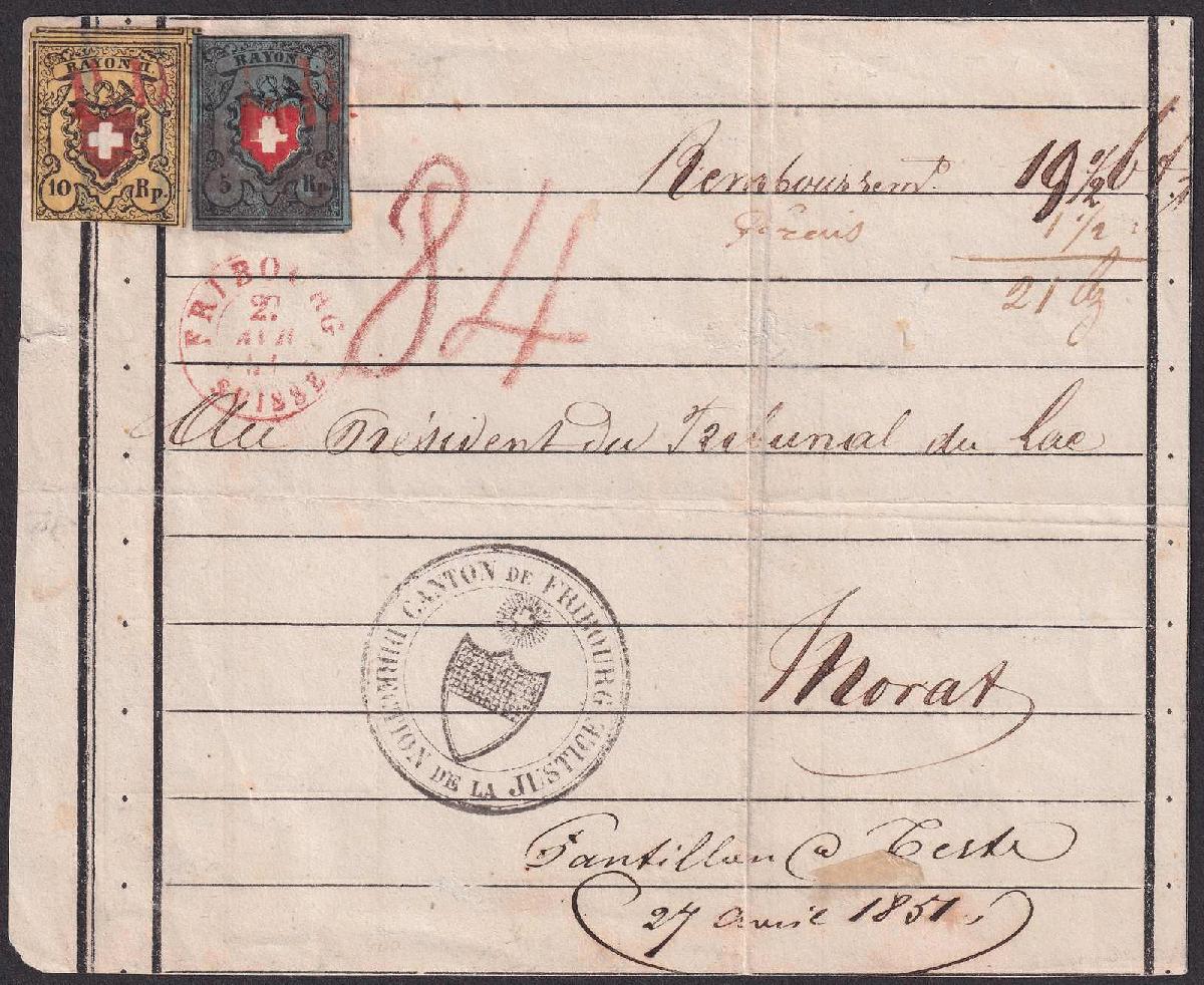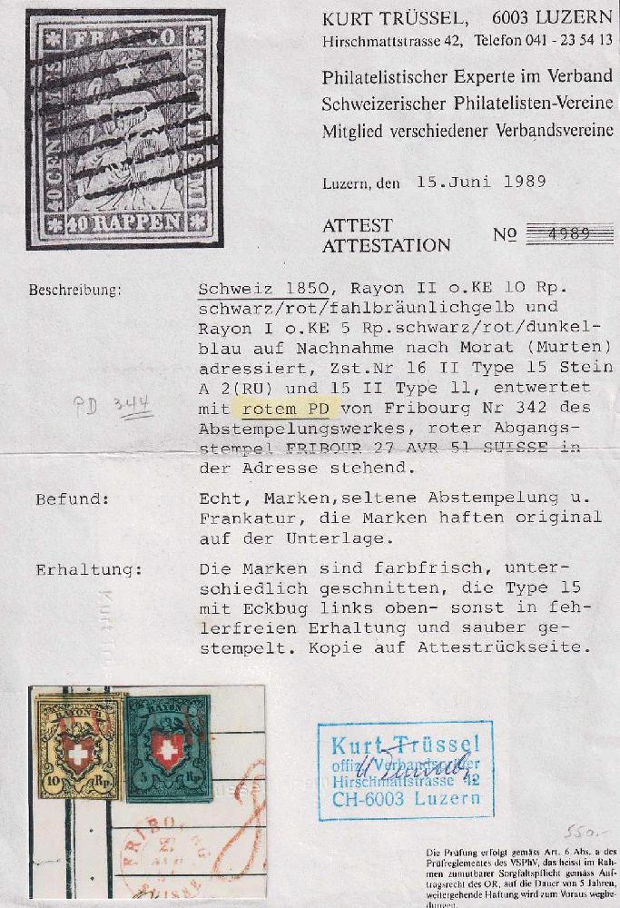 | Zusatzinformationen und Suchstichworte: | Luzernerraute Webshop Los 0000202225 Kanton Freiburg FRIBOURG 1851 (27.AVRIL) nach Morat, Buntfrankatur Rayon II (gelb) 16II T.15 A2-RU + Rayon I (dunkelblau) 15II Type 11, rotes P.D (AW.-Nr.342), stark unregelmässiger Schnitt - 15II fleckig, gelbe Marke mit Abart: Braunrotes Wappen (16II.Ab.8), mit etwas optimistisch formulierten Attest Trüssel (89) Buchpreis weit über 3'000.- preiswerte Buntfrankatur. Festpreis 480,00 CHF |