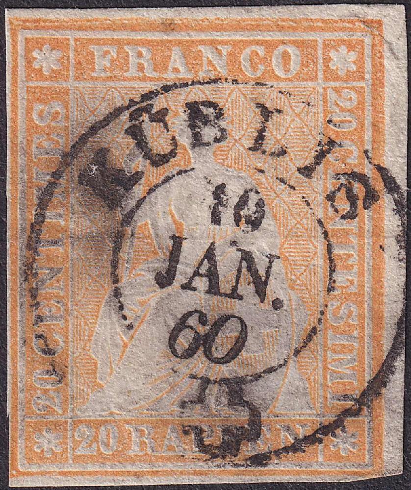 | Zusatzinformationen und Suchstichworte: | Luzernerraute Webshop Los 0000107145 Kanton Graubünden 20c gelborange, 25D (25B3) von KÜBLIS (GR): 10.JAN.1860, frisches sauber zentrisch entwertetes Stück, Bogen-Ecke (rot markiert) leichte Bugspuren sonst ohne Fehler, Attest Bosser (2007) SBK: 240.-+ Festpreis 90,00 CHF |