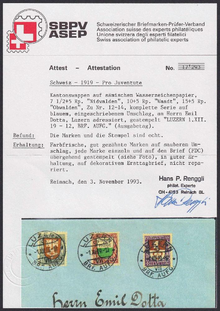 | Zusatzinformationen und Suchstichworte: | Luzernerraute Webshop Los 0000111425 Kanton Luzern 1919, Ersttagsbrief J12-J14 von LUZERN: 1.DEZ.19, saubere Orts-Verwendung, tadellos, Attest Hanspeter Renggli (93) Kat: 3'500.-+ Festpreis 2.000,00 CHF |