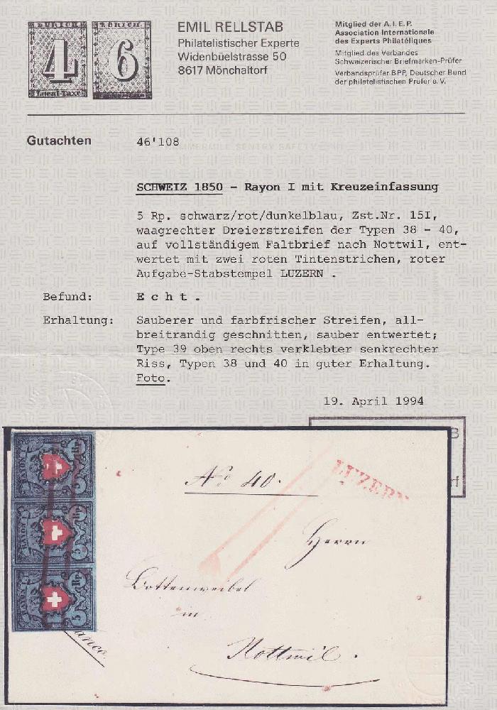 | Zusatzinformationen und Suchstichworte: | Luzernerraute Webshop Los 0003802599 Kanton Luzern LUZERN 1851, Dreierstreifen Rayon I dunkelblau mit Einfassung, T.38+39+40 (A2-U) nach KOTTWIL, auf Botenweibel-Nachnahme-Brief, mit zentrischen Tinten-Striche entwertet, T.39 oben mit Einriss, T.40 mit Knitter, sonst gut erhaltene Einheit mit breitem Schnitt Festpreis 6.500,00 CHF |