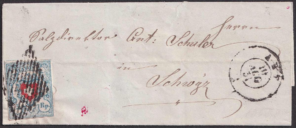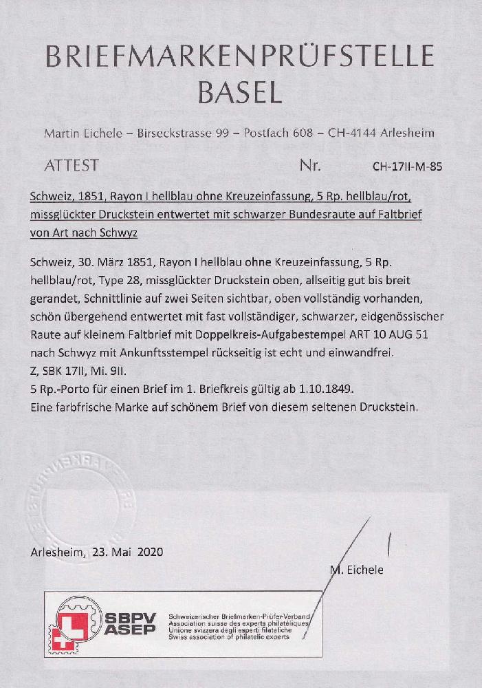 | Zusatzinformationen und Suchstichworte: | Luzernerraute Webshop Los 0002601130 Kanton Schwyz ART 10.Aug.1851 nach SCHWYZ, T.28 M-O (Missglückter Stein) aus dem Kt. SCHWYZ (selten - normalerweise aus Kt. Luzern und Waadt unter anderem auch Zürich) allseitig gute bis breite Ränder, einwandfrei mit Attest Eichele (2020) SBK: 7'000.-+ rückseitig hellblauer Ankunfts-Stempel von Schwyz Festpreis 5.400,00 CHF |