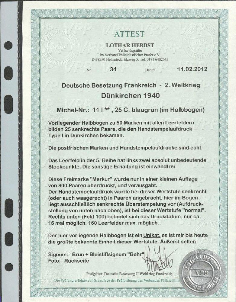 | Prüfgebiet: | Deutsche Besetzung WK 2 Frankreich Dünkirchen |