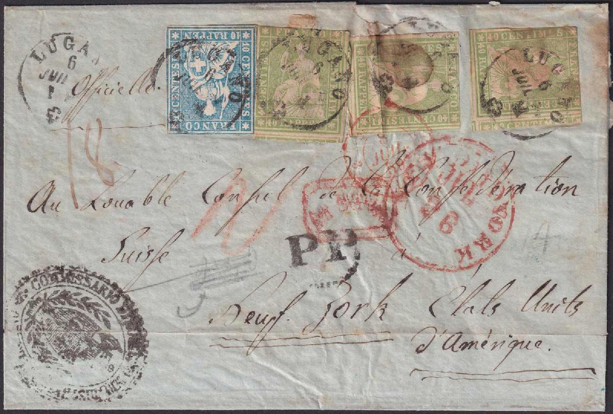 | Zusatzinformationen und Suchstichworte: | Luzernerraute Webshop Los 0000107465 Kanton Tessin USA: 6.JUIL.1859, 1.30 von LUGANO nach New YORK. Seltene Einfrankendreissig-Frankatur der 2.Gewichtsstufe verschickt im 2.Rayon mit französischer Leitung bis zum französischen Einschiffungshafen. Die Taxe für die Atlantik-Überfahrt (15Cts) sowie das inneramerikanische Porto (3Cts) wurden dem Empfänger belastet (somit Taxe mit Tinte 18) Transatlantik-Überfahrt mit Paketboot: AFRICA der CUNARD LINE (Abfahrt Liverpool 9.07, Ankunft New York: 21.07) Strubel mit unterschiedlichem Schnitt, besonders attraktiv jedoch auch die Abstempelung rückseitig. Höchst dekorativer USA-Konsulats-Beleg mit seltenem Porto nach Amerika, ausführliches Attest Urs Hermann (2011) Preiswerte Frankatur mit Schiffs-post Stempel und P.P. im Kreis mit Provenance Peter Kägi. Festpreis 480,00 CHF |