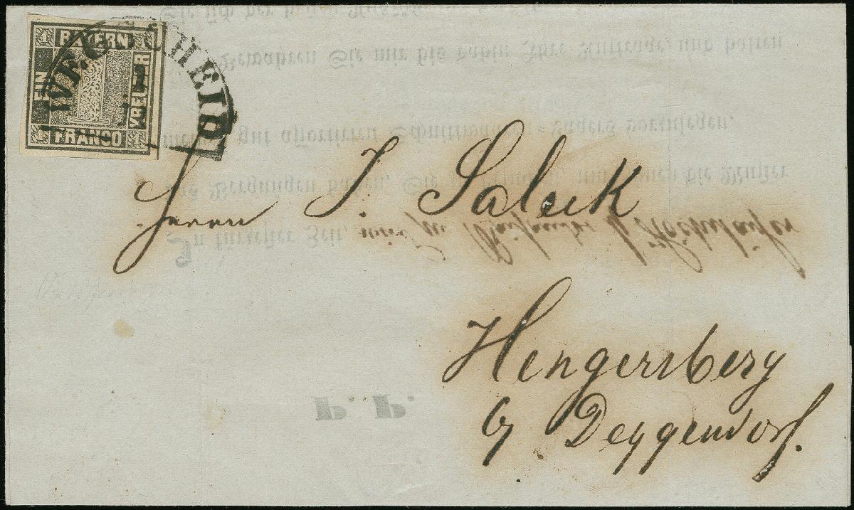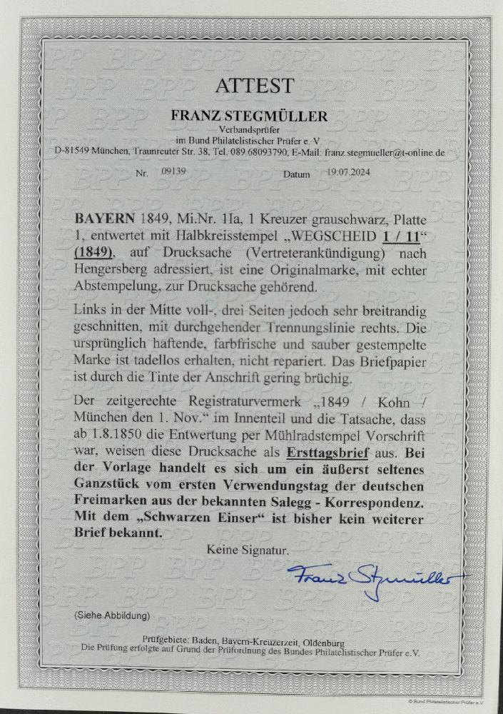 | Zusatzinformationen und Suchstichworte: | Heinrich Köhler 384. Auktion 19./20., 23. - 28. September 2024 Los 3975 Altdeutschland Bayern DER ERSTTAG DER DEUTSCHEN PHILATELIE: 1849, 1 Kreuzer grauschwarz, Platte 1, farbfrisch und voll- bis meist breitrandig, rechts mit durchgehender Trennungslinie, mit sauber und gerade aufgesetztem Ersttagsstempel "WEGSCHEID 1/11" auf vollständiger Drucksache der bekannten Salegg – Korrespondenz, mit Vertreter-Anzeige der Firma J. L. Kohn aus München, nach Hengersberg bei Deggendorf. Auf der Klappe zeitgenössischer Eingangsvermerk "1849 Kohn München den 1 Nov.". Schöne und einwandfreie Erhaltung (das Briefpapier übliche leichte Faltungen und kleine Stellen Tintenfrass). Der einzig bekannte Ersttagsbrief der ersten deutschen Briefmarke und somit eine der größten Kostbarkeiten deutscher Philatelie und Postgeschichte. Nachdem er vor über 50 Jahren von einem bedeutenden deutschen Philatelisten entdeckt wurde, schlummerte er über Jahrzehnte in dessen privater Sammlung und wird heute zum ersten Mal auf einer Auktion angeboten. Fotoatteste Schmitt BPP (2007) und Stegmüller BPP (2024) Zuschlag 440.000,00 EUR |