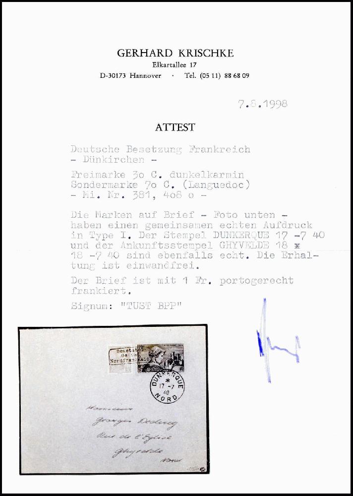 | Zusatzinformationen und Suchstichworte: | Württembergisches Auktionshaus 140. Versteigerung Auktionstermin: 17. - 18. Juni 2022 Los 8312 Deutsche Besetzung II. WK Frankreich Dünkirchen 30 C. in Mischfrankatur mit Gedenkmarke 70 C. (Languedoc/Südfranzösin 70 C.) auf tadellosem und portoger. frankiertem Brief von Dünkirchen nach Ghyvelde. Briefseltenheit, sign. Tust BPP, Fotoattest Krischke. Katalogpreis: 2.300,- Ausruf 600,00 EUR |