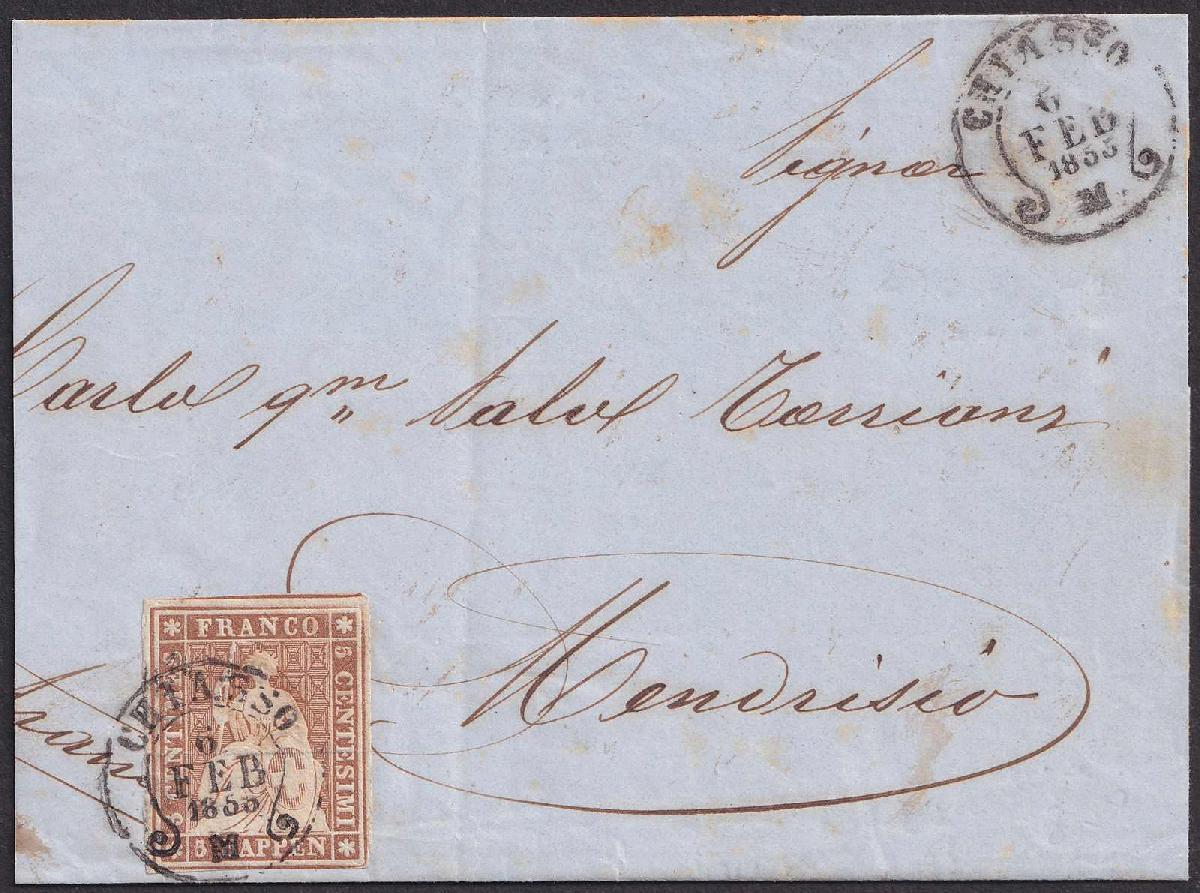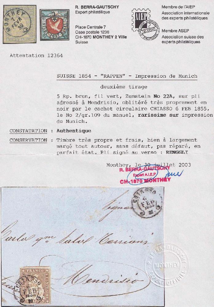 | Zusatzinformationen und Suchstichworte: | Luzernerraute Webshop Los 0002601230 Kanton Tessin CHIASSO: 6.2.1855 nach MENDRISIO, 22A3 weissrandig. Seltener, vorschriftswidriger Datum-Rund-Stempel, fehlerfrei mit Attest Berra (2003), sign. Renggli, trotz leichter Patina-Spuren dekorativ wirkend. Festpreis 550,00 CHF |