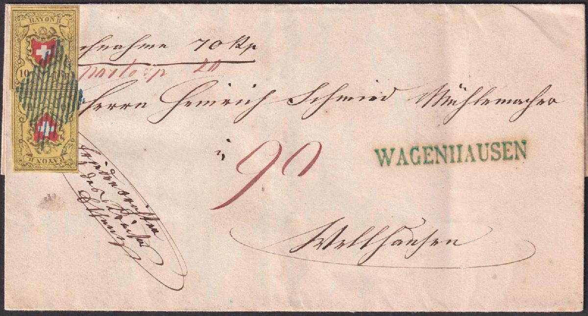 | Zusatzinformationen und Suchstichworte: | Luzernerraute Webshop Los 0000104988 Kanton Thurgau WAGENHAUSEN 1853 (in grün) nach Wellhausen, fehlerfreie Frankatur mit zentrisch entwerteter Paar-Einheit. T.8 E-LO und T.13 E-RO (aus unterschiedlichen Bogengruppen) frischer Beleg mit Inhalt, einwandfrei mit Attest Eichele (2000) LP für den Heimatsammler Festpreis 1.300,00 CHF |