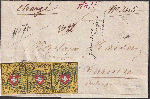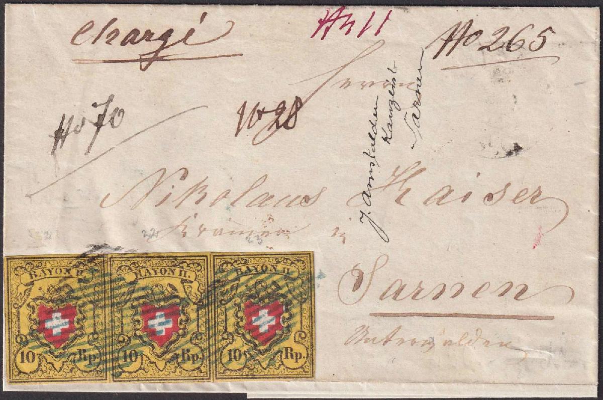 | Zusatzinformationen und Suchstichworte: | Luzernerraute Webshop Los 0000107737 Kanton Unterwalden SARNEN (einkommend aus dem Kanton St.Gallen) Dreierstreifen: Rayon II (gelb) T.21+22+23 B-RO auf dickem Karton-Papier (16II.1.09) mit schwarzen Rauten abgestempelt, mit Nach-Entwertung in Sarnen, da die Stempel zu wenig stark waren. Ursprünglich von einer kleinen Ortschaft im Kanton St.Gallen mit Chargé-Nr. und sehr gut geschnittenem Streifen, links im Rand etwas bestossen, oben mittig mit Vortrennschnitt zwischen den Marken, mit einwandfreiem Attest von Marchand. (Abart ging im Attest vergessen) Brief vermutlich von BENKEN (Ortschaft war bekannt für schwache Abschläge) über UZNACH nach WATTWYL über GERSAU nach SARNEN. (rückseitig mit vier Stempeln) Attraktive Frankatur in sehr guter Präsentation, Buchpreis: 4'000.- Festpreis 1.850,00 CHF |
