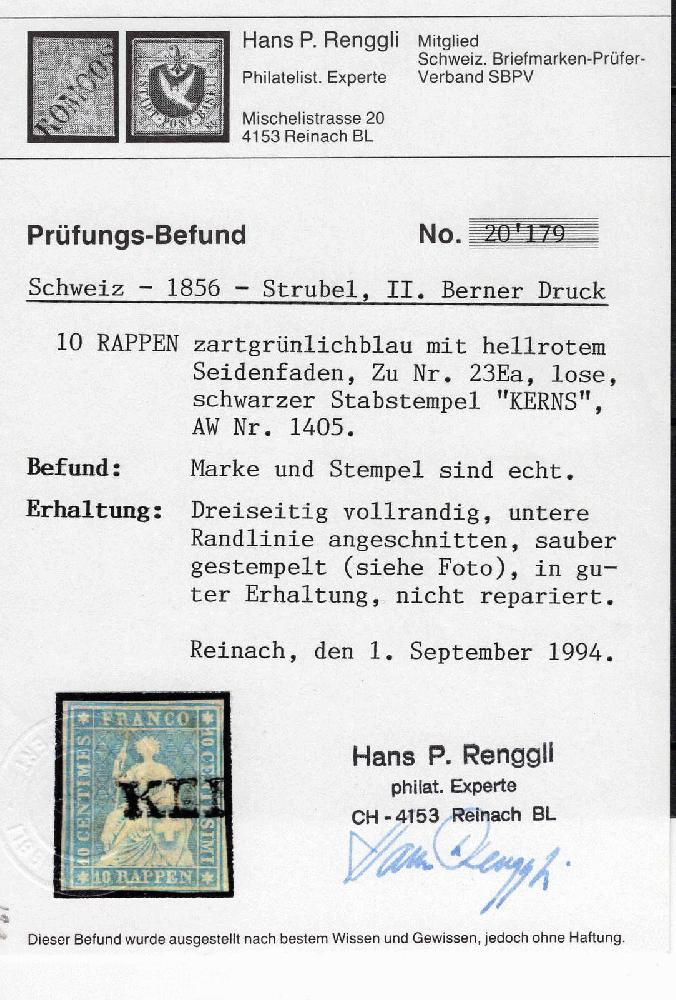 | Zusatzinformationen und Suchstichworte: | Pilatusmail Frühlingspreisliste 2024 Los 2852 Kanton Unterwalden KERNS 1856, 10Rp zartgrünlichblau, farbfrische Marke, dreiseitig vollrandig, untere Randlinie angeschnitten, Stabstempel KERNS (AW Nr. 1405) Festpreis 150,00 CHF |