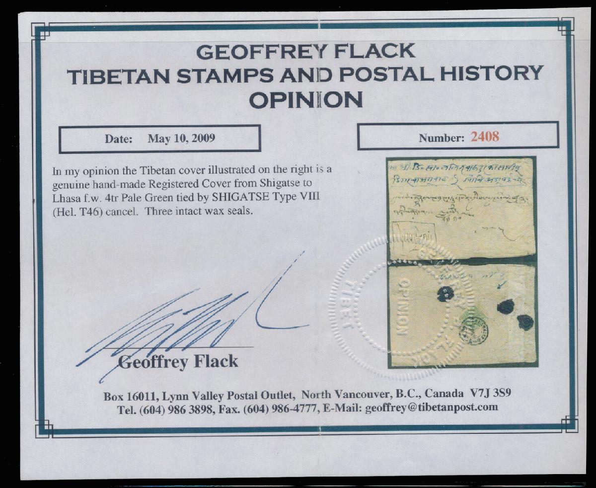 | Zusatzinformationen und Suchstichworte: | Sparks 51. Auktion 17. - 19. Oktober 2024 Los 715 Tibet 1930er-Jahre, 4tr hellgrün auf Brief nach Lhasa, Marke mit breiten Rändern auf zwei Seiten, entwertet auf Rückseite von Einschreibebrief bei Shigatse Type VIII Datumsstempel (Hellrigl T46), typische faltig vorgefunden hierzu Handpapier, eine attraktive und seltene Verwendung; mit 2009 Geoffrey Flack Attest. Schätzpreis $100 Ausruf 40,00 CAD |