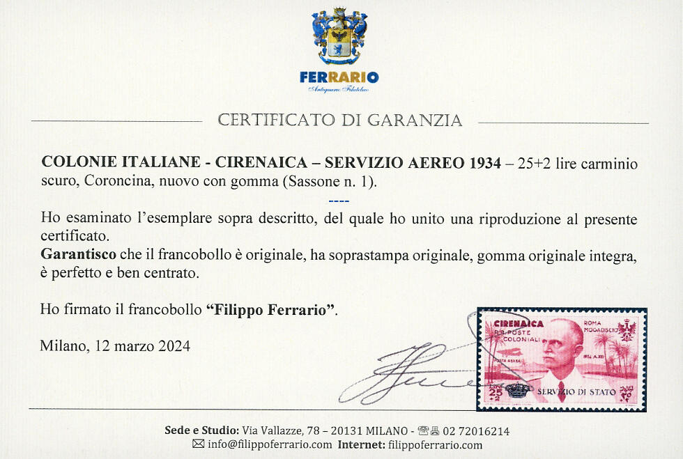 | Zusatzinformationen und Suchstichworte: | Ferrario 34. Auktion 28. September 2024 Los 1953 Italienisch Cyrenaica SERVIZIO AEREO 1934 - 25 + 2 lire Coroncina (1), gomma originale integra, perfetto, ottima qualità Ausruf 1.000,00 EUR |