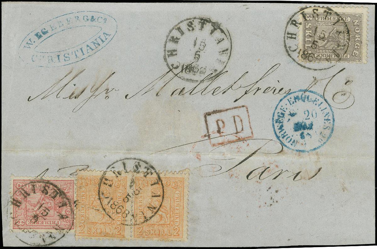 | Zusatzinformationen und Suchstichworte: | Heinrich Köhler 384. Auktion 19./20., 23. - 28. September 2024 Los 1352 Norwegen 1863,3s graulila, 1867-8 2s orange waagrechtes Paar und 8s karminrosa, alle gestempelt auf 1868 Briefvorderseite nach Paris bei Christiania Datumsstempel (Mai 15), rotem Kasten PD und blau Norwege/Enquelines Eingang Datumsstempel (Mai 20), waagrecht Registraturbug und einige leichte Flecken, aber eine seltene Taxierung und Mischfrankatur, faktisch nur während 1868; Zuschlag 340,00 EUR |