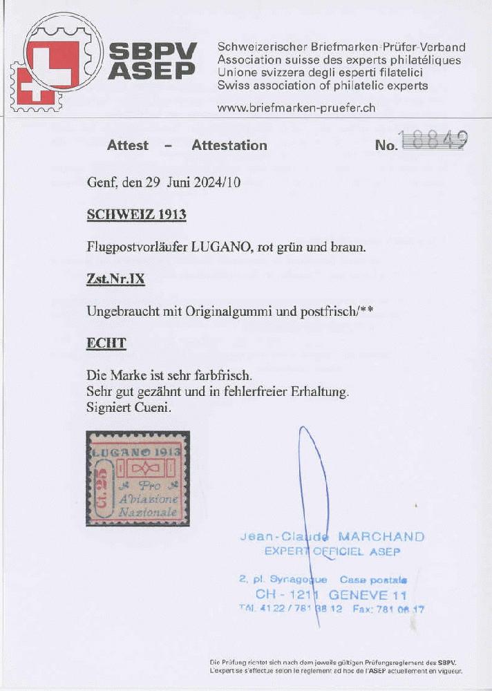 | Zusatzinformationen und Suchstichworte: | 11. Heuberger Auktion 4. - 5. Oktober 2024 Los 80 Schweiz Flugpostmarken 1913: Vorläufer Lugano, postfrisch mit vollem Originalgummi, sehr gut gezähnt und in einwandfreier Erhaltung. Ein seltenes Stück, Ausruf 4.000,00 CHF |