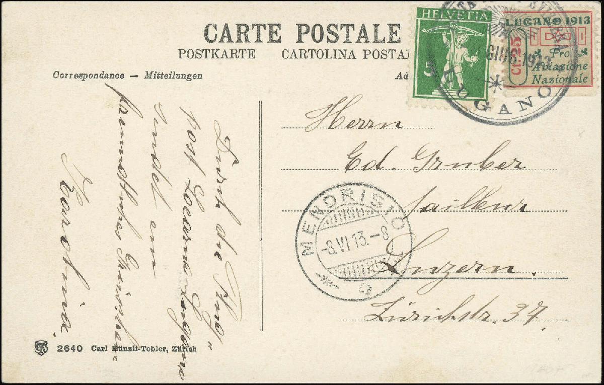 | Zusatzinformationen und Suchstichworte: | 11. Heuberger Auktion 4. - 5. Oktober 2024 Los 81 Schweiz Flugpostmarken 1913: Vorläufer Lugano, für diese schwierige Ausgabe besonders gut gezähnt, unten ungezähnt, zus. mit Tellknabe 5 Rp. grün, klar entw. mit schwarzem Sonderstp. "POSTA AERA SVIZZERA 8 GIUG. 1913 LUGANO" auf Ansichtskarte "Locarno" nach Luzern adressiert Ausruf 1.000,00 CHF |