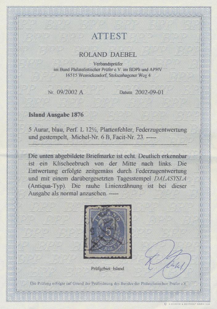 | Zusatzinformationen und Suchstichworte: | Christoph Gärtner 60. Auktion 16. Oktober 2024 Los 5034 Island 1876 5 aur blau, Zähnung 12½, gebrochene Platte (weiße Linie aus der linken durch oben des "5" ), gebraucht mit pen-cross und "DALASYLA 5/10" Datumsstempel, farbfrisch, übliche Zähnung (nicht perfekt), noch gut Ausruf 100,00 EUR |