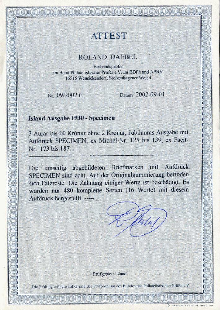 | Zusatzinformationen und Suchstichworte: | Schlegel Online-Shop Los 4201504083 Island 1930, 3 A. bis 10 Kr. 1000 Jahre Allthing ohne den Wert zu 2 Kr., 14 ungebrauchte Werte mit waager. Aufdruck "SPECIMEN", farbfrisch, die Werte zu 3 und 5 A. sowie zu 10 Kr. eckrund, sonst gute Qualität, Fotoattest Daebel BPP, im Michel nicht gelistet Festpreis 240,00 EUR |