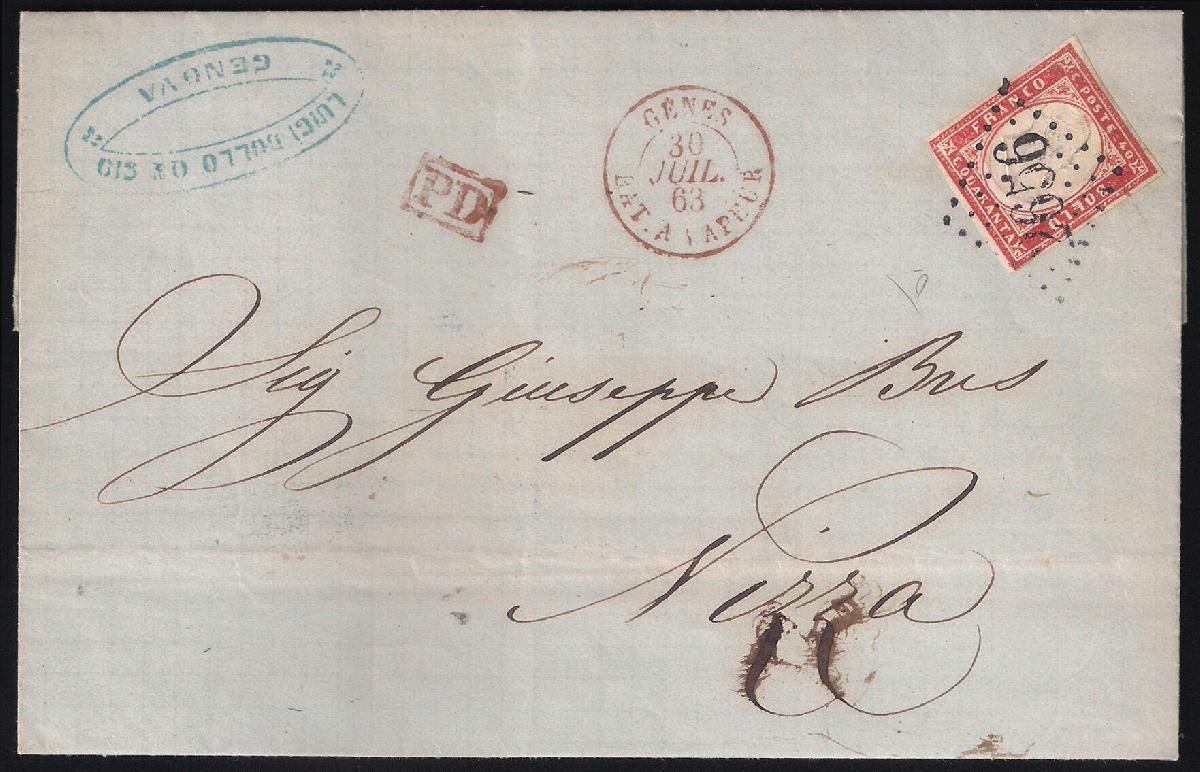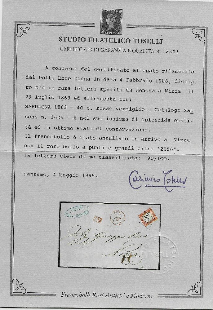 | Zusatzinformationen und Suchstichworte: | Filatelia Gazzera Auktion 15. Oktober 2024 Los 155 Italien Staaten Sardinien Lettera da Genova a Nizza inpostata al battello affrancata con c.40 rosso vermiglio annullato allo sbarco a Nizza con bollo a punti e grandi cifre 2656 (16Da p.ti 13 cat.8000) molto fresca Ausruf 360,00 EUR |