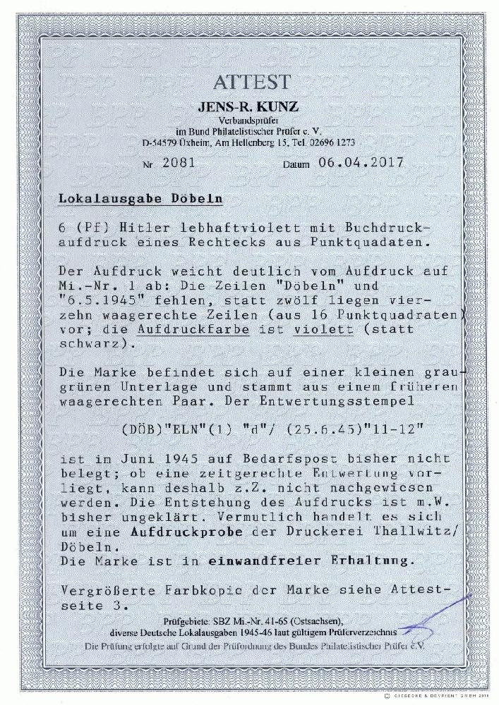 | Prüfgebiet: | Deutsche Lokalausgaben 1945 Döbeln |