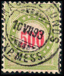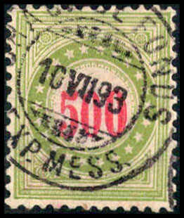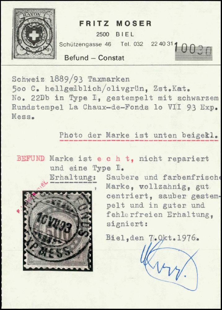| Zusatzinformationen und Suchstichworte: | 57. Jean-Paul Bach Auktion 5. Oktober 2024 Los 524 Schweiz Portomarken 1889/93, 16.-19. Auflage (Da+Db),Type I+II, KZ. I 500 Rp. olivgrün, Type I, farbfrisch, einwandfrei gezähnt, sauberer Vollstempel CHAUX DE FONDS EXP. MESS. 10 VII 93, fehlerfrei. Signiert und Befund Moser, Attest BP Ausruf 400,00 CHF |
