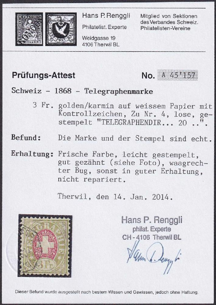 | Prüfgebiet: | Schweiz - Telegraphenmarken |