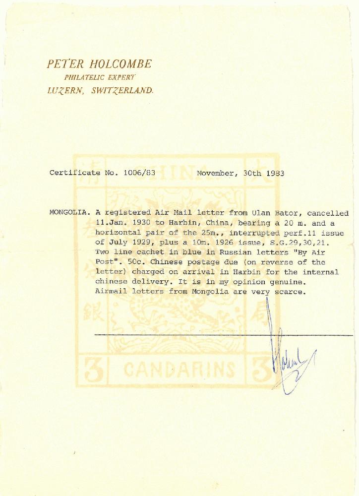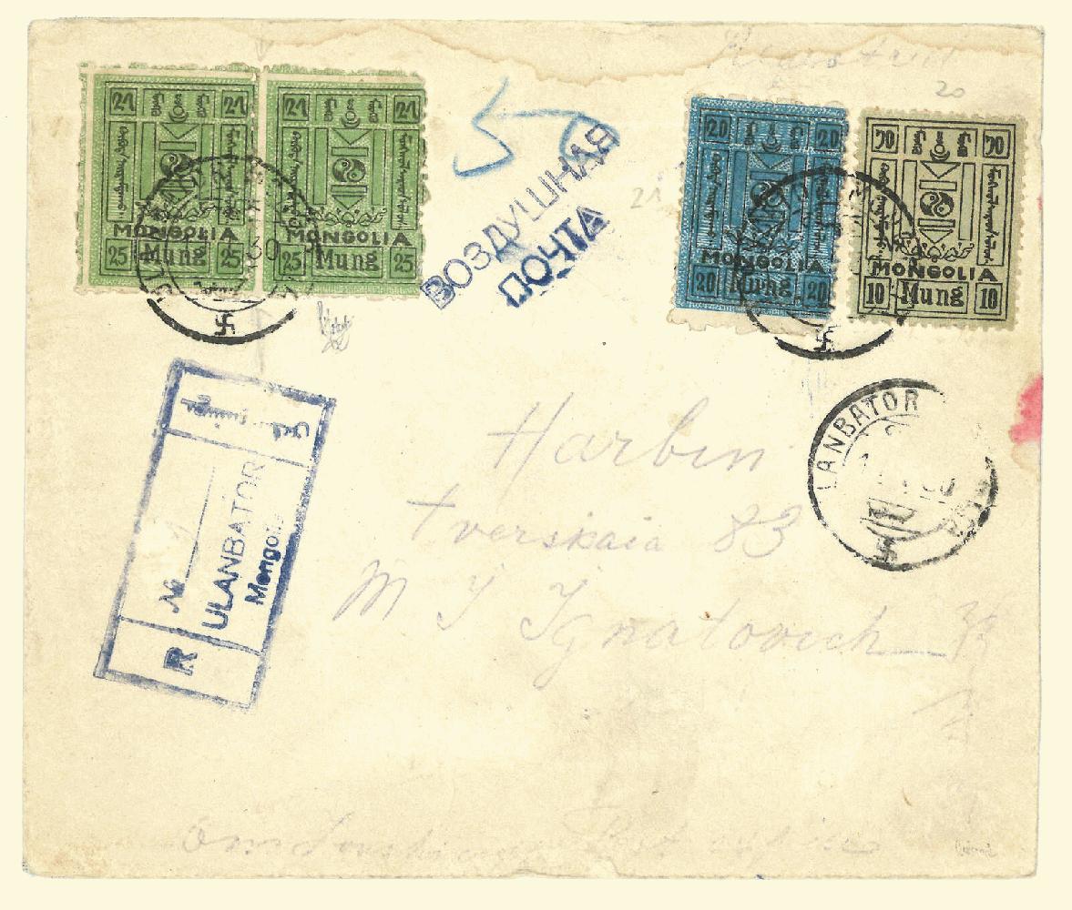 | Zusatzinformationen und Suchstichworte: | 8. Ava Auctions Limited Auktion 9.-11. November 2024 Los 678 Mongolei 1930 Ulanbator (11 Jan) to Harbin. Registered airmail cover, f.w. Mongolian 4th issue interrupted perf 10 Mung + 20 Mung + 25 Mung in pair, tied by Ulanbator cds., alongside with registered mark and airmail mark. In combination with ROC postage due 10c + 20c in pair, tied by Harbin arrival cds Ausruf 6.000,00 HKD |