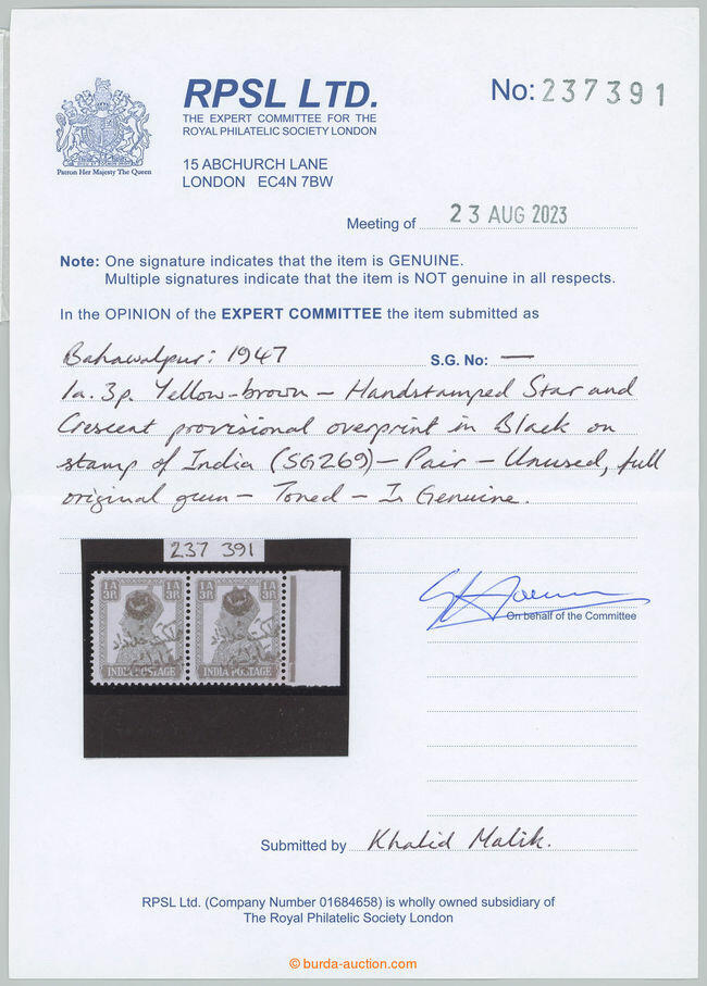 | Zusatzinformationen und Suchstichworte: | Burda 76. Auktion 14. - 15. September 2024 Los 1136 Pakistan Bahawalpur 1947 provisorisch/Inder Georg VI. 1A3P als Paar mit Überdruck Stern und Halbmond; Pracht, Attest RPSL, selten Ausruf 613,00 EUR |