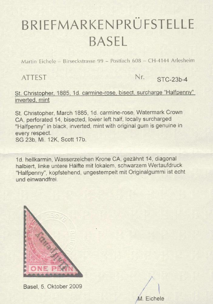 | Zusatzinformationen und Suchstichworte: | 26. classicphil GmbH Auktion 4. November 2024 Los 1193 St. Christopher St. Kitts 1885,1/2d - halbierte 1d, unten links halb, karminrosa, halber Pfennig Überdruck kopfstehend, großer Teil Originalgummi, Wasserzeichen CA, Attest Eichele, tadellose Erhaltung, Kabinett! Schätzpreis 270 EUR. Ausruf 70,00 EUR |