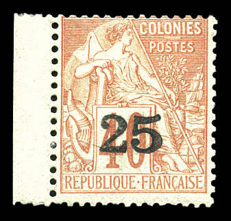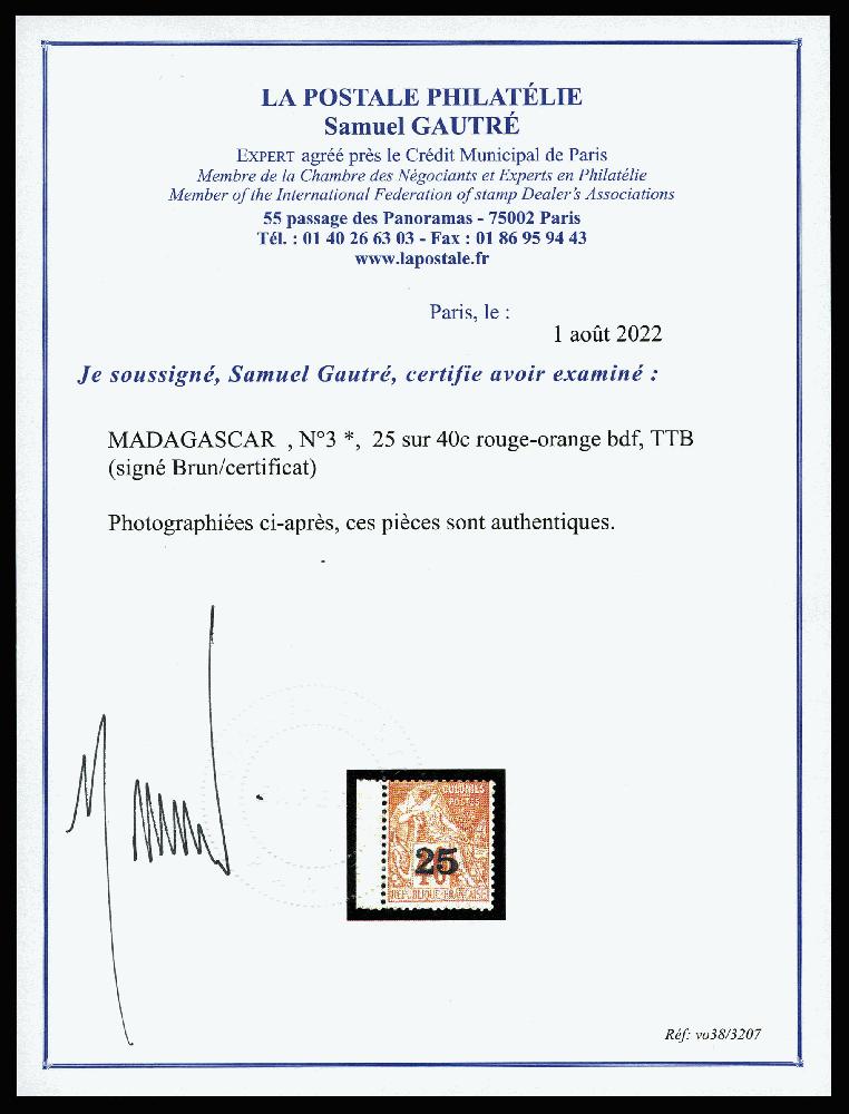 | Zusatzinformationen und Suchstichworte: | La Postale Philatélie 46. Auktion 4. Oktober 2024 Los 3430 Madagaskar N°3, 25 sur 40c rouge-orange bdf, TTB (signé Brun/certificat) Qualité: * Cote: 900 euros Ausruf 290,00 EUR |
