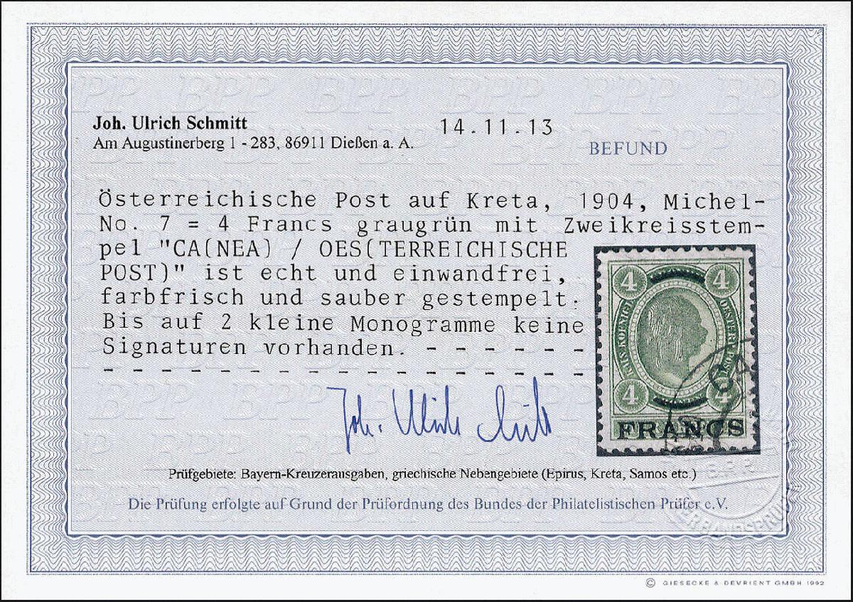 | Zusatzinformationen und Suchstichworte: | Götz 408. Auktion 21. - 23. Oktober 2024 Los 3840 Österreich Post auf Kreta 4 Fr. a. 4 Kr. graugrün, Höchstwert Freimarken 1903, gut gezähnt, farbfrisch, tadellos # "Canea". Ausruf 150,00 EUR |