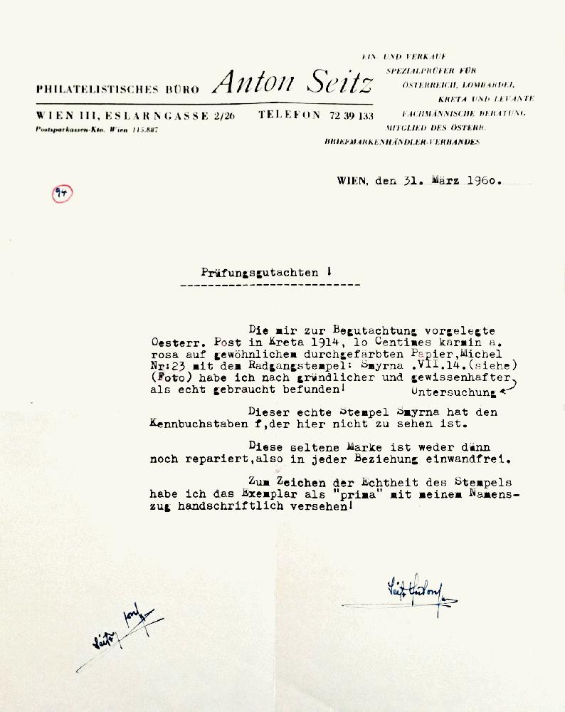 | Zusatzinformationen und Suchstichworte: | Austrophil - 183. Briefmarkenauktion 10. Oktober 2024 Los 1174 Österreich Post auf Kreta 1914 10 CENT. karmin auf rosa mit Radgangstempel von Smyrna, 1914 frisches P! Ausruf 500,00 EUR |