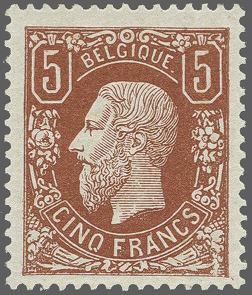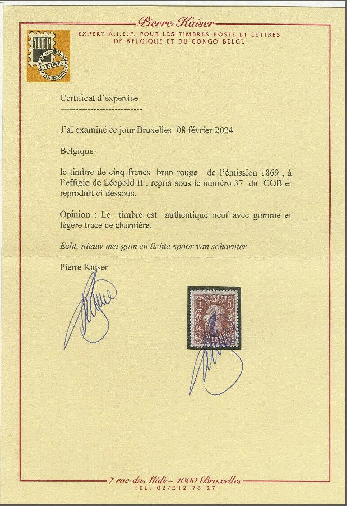 | Zusatzinformationen und Suchstichworte: | Corinphila Veilingen 259. Auktion 13. - 14. September 2024 Los 2302 Belgien Leopold II 5 frank brown-red with Pierre Kaiser 2024 certificate: authentique neuf avec gomme et légère trace de charnière, cat.v. 2300 Ausruf 200,00 EUR |