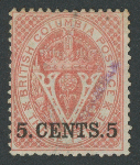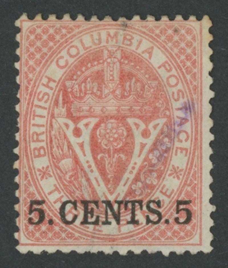 | Zusatzinformationen und Suchstichworte: | 257. Abacus Auktion 27. - 30. August 2024 Los 1670 Britisch Columbia und Vancouver Inseln Britisch Kolumbien: 1867 Aufdrucke Zähnung 14 5. CENTS. 5 auf 3d blassrot SG 29 (Scott 9), hell small-part Barren Stempeln in violett, ein etwas kurz Zähnung auf der linken Seite, Katalogwert £200 (US$250). Zuschlag 95,00 AUD |