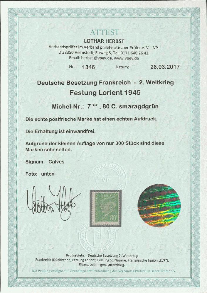 | Zusatzinformationen und Suchstichworte: | Gert Müller 114. Auktion Auktionstermin: 25. Mai 2022 Los 3195 Deutsche Besetzung II. WK Frankreich Lorient 80 C. Marschall Petain mit Aufdruck "FESTUNG LORIENT", farbfrisch und tadellos postfr. Auflage nur 300 Stück und im Michel deutlich unterbewertet! Geprüft Calves, Fotoattest "DIE ERHALTUNG IST EINWANDFREI" Herbst VP. Ausruf 1.000,00 EUR |