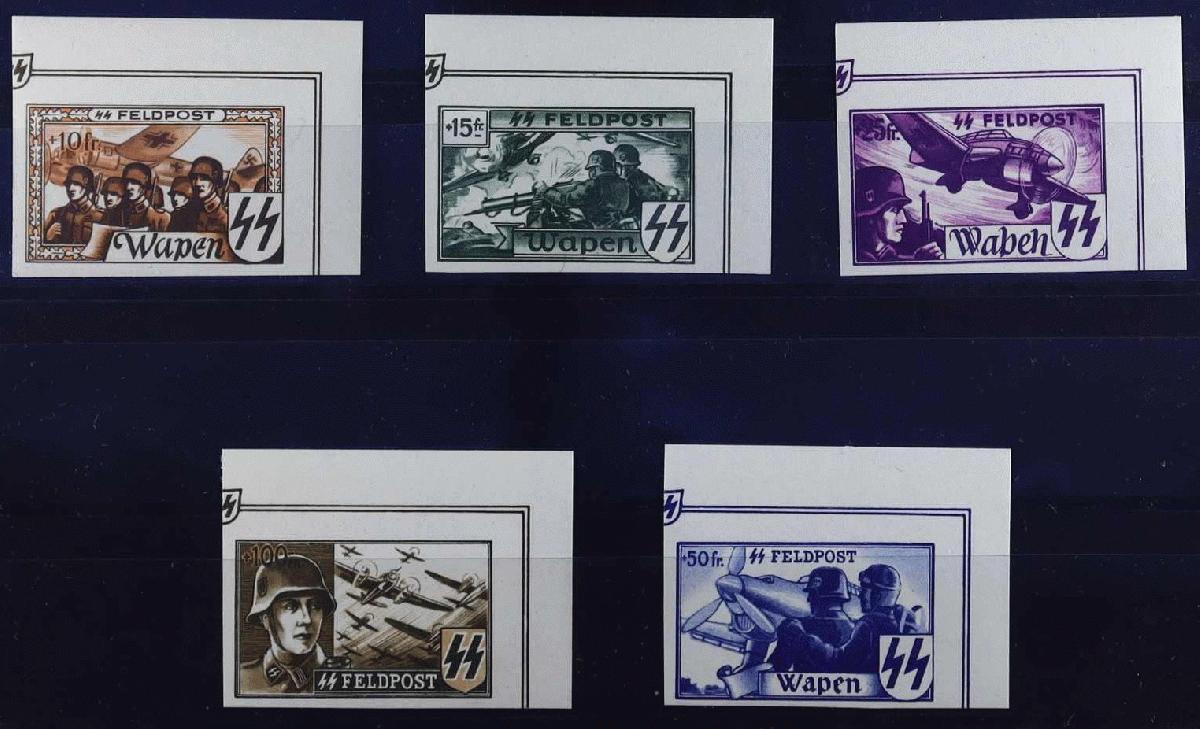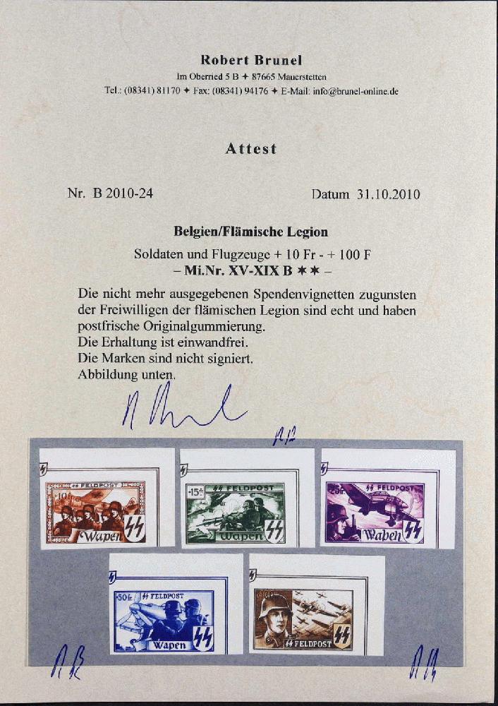 | Zusatzinformationen und Suchstichworte: | Schlegel Online-Shop Los 4201505132 Deutsche Besetzung II. WK Belgien Flämische Legion 1944, 10 Fr. - 100 Fr. Soldaten und Flugzeuge, als ungezähnter Satz postfrisch, Eckrand unten link Festpreis 250,00 EUR |