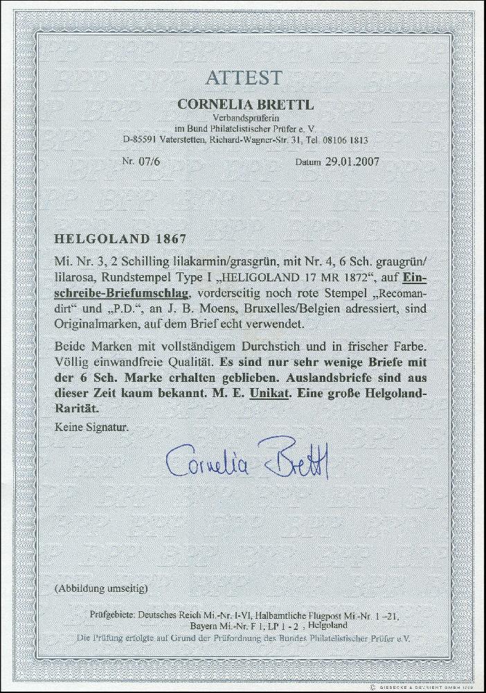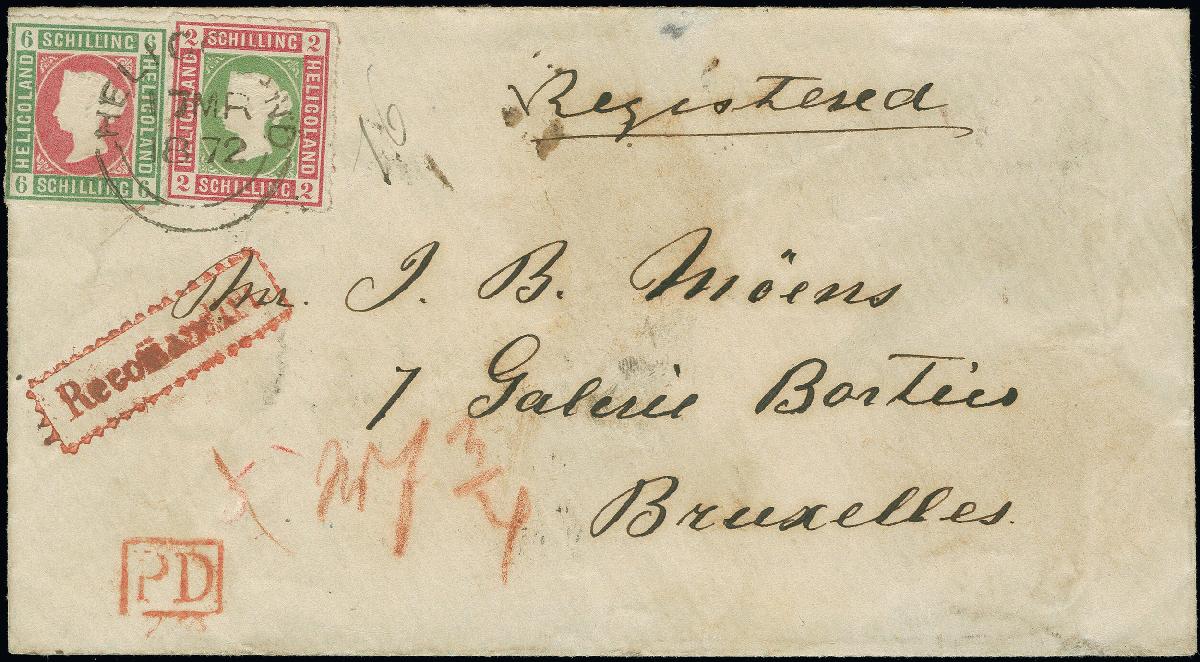 | Zusatzinformationen und Suchstichworte: | Heinrich Köhler 384. Auktion 19./20., 23. - 28. September 2024 Los 7063 Altdeutschland Helgoland 1867, 2 Schilling lilakarmin/dunkelgelblichgrün sowie 6 Schilling graugrün/lilarosa, farbfrisch und gut durchstochen, 6 Schilling winzig über den Rand geklebt, sauber mit Kreisbogenstempel “HELIGOLAND 17 MR 1872” auf recomandiertem Briefkuvert mit nebengesetztem roten Zackenkranzstempel “Recomandirt” sowie Ra1 “PD” über “HAMBURG 19 3 72” an den bekannten Briefmarkenhändler J.B. Moens nach Brüssel mit Ankunftsstempel. Ein phantastischer und sehr attraktiver Brief, Briefe mit der 6 Schilli Zuschlag 10.500,00 EUR |