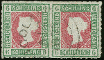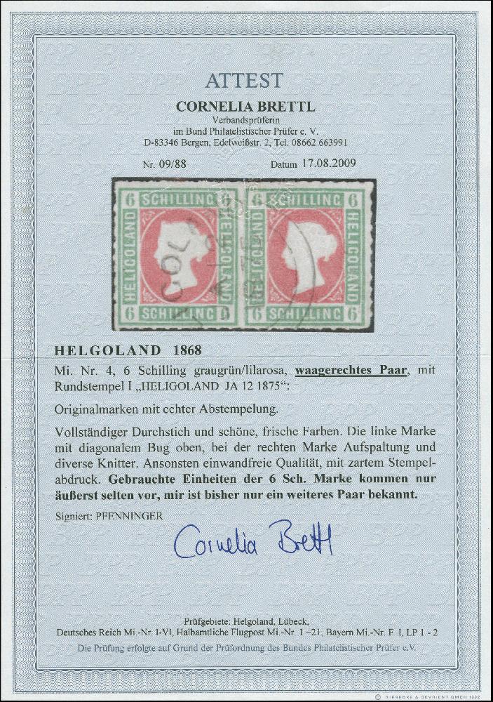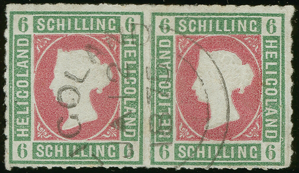 | Zusatzinformationen und Suchstichworte: | Heinrich Köhler 384. Auktion 19./20., 23. - 28. September 2024 Los 7072 Altdeutschland Helgoland 6 Schilling graugrün/lilarosa im waagerechten Paar, farbfrisch und gut durchstochen, sauber mit Kreisbogenstempel “(HE)LIGOLAND JA 12 1875” entwertet, die linke Marke leichter diagonaler Bug, rechte Marke winzige Aufspaltung bzw. Knitter, optisch in keiner Weise störend und aufgrund der Seltenheit auch völlig belanglos, wir haben nur ein weiteres zweifelsfrei echt gebrauchtes Paar dieser Marke registriert Zuschlag 800,00 EUR |