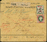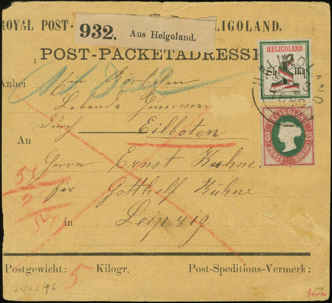| Zusatzinformationen und Suchstichworte: | Heinrich Köhler 384. Auktion 19./20., 23. - 28. September 2024 Los 7162 Altdeutschland Helgoland 1875, 1 Mark dunkelgrün/schwarz/karmin sowie 1875 25 Pfennig lilakarmin/grün, je farbfrisch und sauber mit einem zentrischen Kreisbogenstempel "HELIGOLAND SP 23 1889" auf Eilboten-Paketkarte für “ein Körbchen lebende Hummer” via “CUXHAVEN 24 9 89” nach Leipzig mit Ankunftsstempel, 1 Mark ein fehlender und zwei verkürzte Zähne, die Karte einmal senkrecht gefaltet mit üblichen Beförderungsspuren, eine sehr seltene und tarifgerechte Paketkarte mit der 1 Mark Zuschlag 2.000,00 EUR |