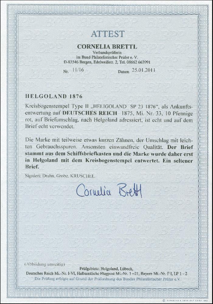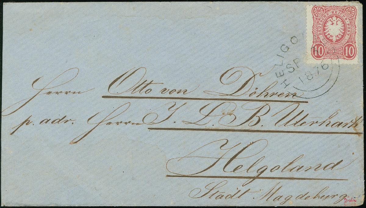 | Zusatzinformationen und Suchstichworte: | Heinrich Köhler 384. Auktion 19./20., 23. - 28. September 2024 Los 7343 Deutsches Reich, 1875 Pfennige 1875, 10 Pfennigre rot, sauber bei Ankunft mit Kreisbogenstempel “HELIGOLAND SP 23 1876” entwertetem, auf in den Schiffsbriefkasten eingeworfenem Kuvert nach Helgoland. Die Frankatur winzig verkürzte Zahnspitzen, das Kuvert leichte Gebrauchsspuren, in insgesamt sehr schöner und attraktiver Erhaltung, sehr selten Ausruf 500,00 EUR |