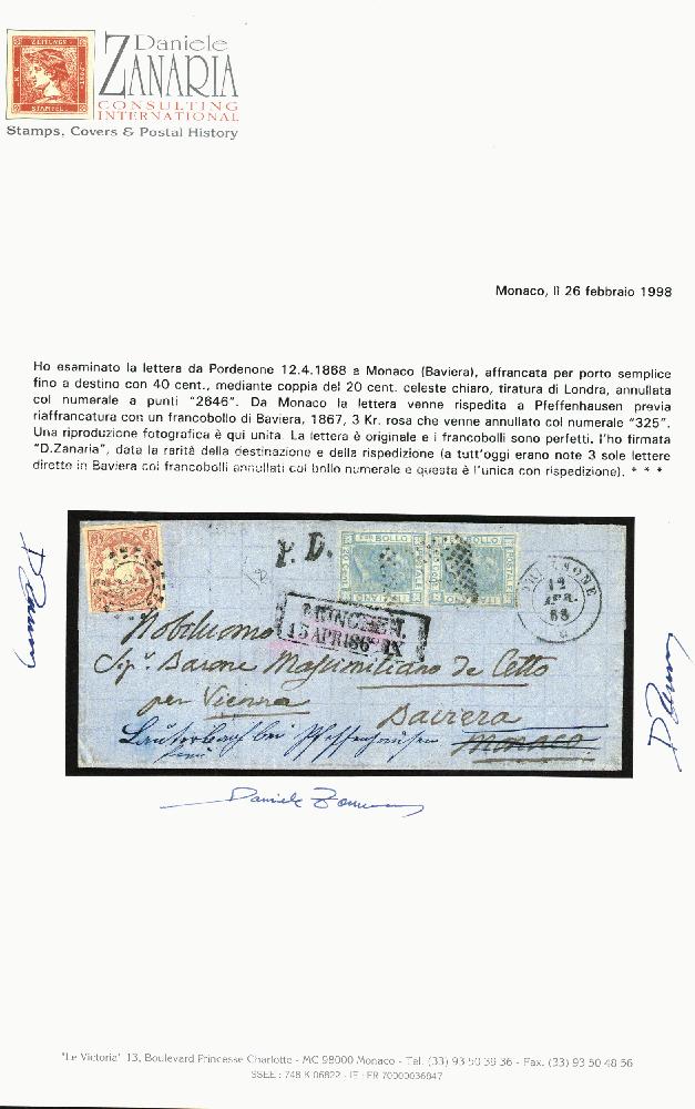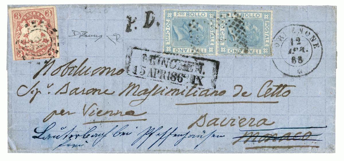 | Zusatzinformationen und Suchstichworte: | Lugdunum 129. Auktion 16. September 2024 Los 1253 Altdeutschland Bayern Bayern: 1868 Italien 20c (x 2) auf Brief aus PORDENONE zu MONACO (Bayern), weitergeleitet nach PFEFFENHAUSEN mit Bayern 3 Kr mit vier Rändern Stempel 325. seltene Kombination Ausruf 2.500,00 EUR |