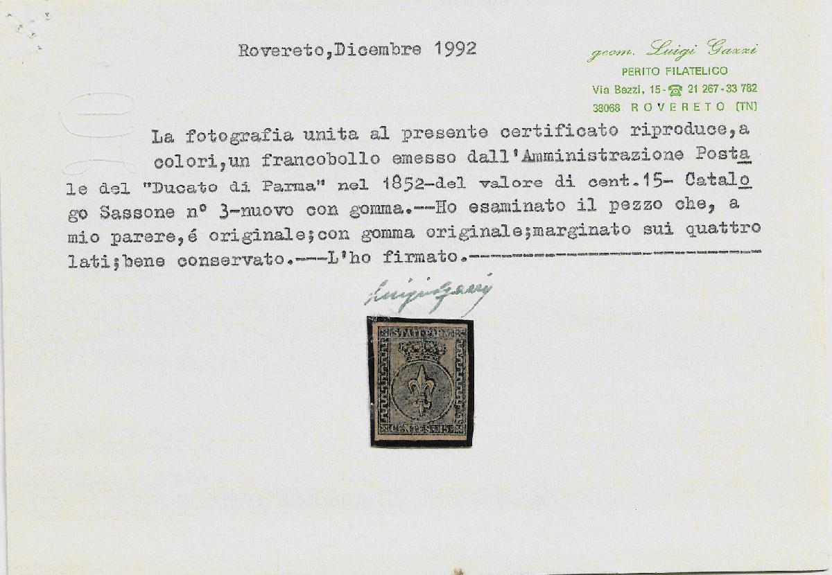 | Zusatzinformationen und Suchstichworte: | Filatelia Gazzera Auktion 15. Oktober 2024 Los 112 Italien Staaten Parma 1852 c.15 rosa nuovo con gomma originale, ben marginato e senza difetti Ausruf 900,00 EUR |