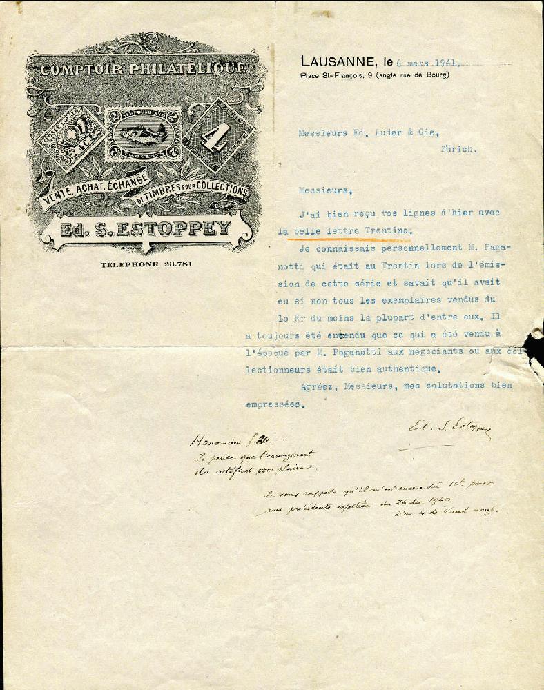 | Zusatzinformationen und Suchstichworte: | Schlegel Online-Shop Los 4201501881 Italien Besetzung I. WK Trentino 1918, 3 H.-10 K., komplette Serie auf eingeschriebenem Brief vom 20. Dezember 1918, dabei die 10 K. in der extrem seltenen Farbe Dunkelviolett. Die Marken wurden zur Kontrolle gelöst und befinden sich in einer farbfrischen Luxusqualität. Ordnungshalber sei erwähnt, dass der Brief außerhalb des Markenbereiches einmal senkrecht gefaltet ist. Es ist nur noch ein weiterer nahezu identischer Beleg bekannt, der im Sassone Katalog abgebildet ist, dieser allerdings mit der häufigeren hellen Variante der 10 K. Von insgesamt 31 überdruckten 10 K. Marken befinden sich lediglich 11 in der dunkelvioletten Variante. Die Bewertung im Sassone, der beide Marken gleich bewertet, ist somit nicht korrekt und vermutlich der Tatsache geschuldet, dass aufgrund des fehlenden Angebotes der seltenen Variante kein aktueller Katalogpreis ermittelt werden kann. Nicht unerwähnt sollte bleiben, dass auch die 90 H. und die 4 K. auf Brief besonders selten sind. Das non plus Ultra der Italien-Philatelie. Der Brief wäre natürlich auch eine außergewöhnliche Bereicherung für jede große Österreich-Spezialsammlung. Beiliegend interessanter Schriftverkehr Festpreis 13.200,00 EUR |