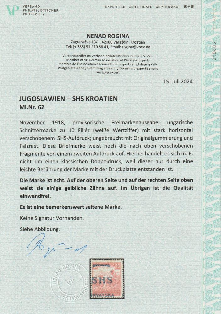 | Zusatzinformationen und Suchstichworte: | Philadria 32. Auktion 12. Oktober 2024 Los 358 Jugoslawien 1918 Croatia SHS. "Harvesters", 10 fil. "White Numerals", mint hinged withoverprint shifted to the left. Another, slight trace of overpint is visible. It is just smudged overprin ('Kiss-print't, not a real double overprint. Stamp has some brown perfs in upper part. Ausruf 360,00 EUR |