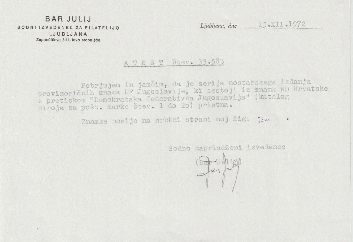 | Zusatzinformationen und Suchstichworte: | Philadria 32. Auktion 12. Oktober 2024 Los 298 Jugoslawien Volksrepublik Bosnien u. Herzegowina 1945 Bosnia, Mostar Provisional Issue 1945 in complete set, MNH of good/usual quality. Kn. 1,00 stamp "Katarina Zrinjska" has a brown spot in gum Ausruf 150,00 EUR |