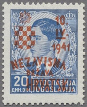 | Zusatzinformationen und Suchstichworte: | Auction Galleries Hamburg 33. Auktion 13. - 14. September 2024 Los 653 D Kroatien 1941, Jugoslawien-Freimarken 15 Werte komplett mit farbigen Aufdrucken, davon 13 Werte in tadelloser postfrischer Erhaltung sowie 12 und 20 Dinar in tadelloser ungebrauchter Erhaltung, Attest Marjanovic von 1962 Zuschlag 480,00 EUR |