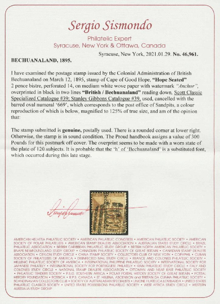 | Zusatzinformationen und Suchstichworte: | 26. classicphil GmbH Auktion 4. November 2024 Los 622 Betschuanaland 1895, 2d., bistre, perf 14, wmk Anchor, opt. in black, cancelled with numeral 669, which corresponds to the post office of SANDPITS (Proud handbook assigns a value of £300), used Ausruf 70,00 EUR |