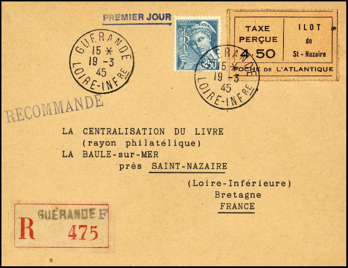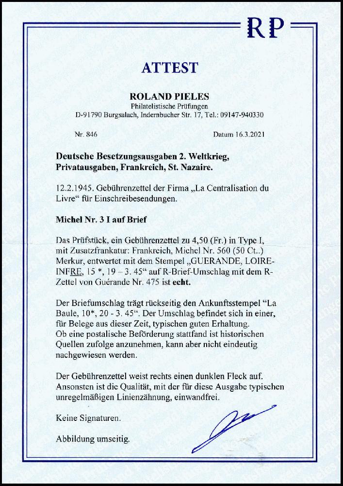 | Zusatzinformationen und Suchstichworte: | Württembergisches Auktionshaus 140. Versteigerung Auktionstermin: 17. - 18. Juni 2022 Los 8328 Deutsche Besetzung II. WK Frankreich St.Nazaire 4,50 F., Gebührenzettel zusammen mit Frankreich 50 C. auf tadellosem R-Brief, Fotoattest Pieles. Katalogpreis: 300,-+ Ausruf 150,00 EUR |