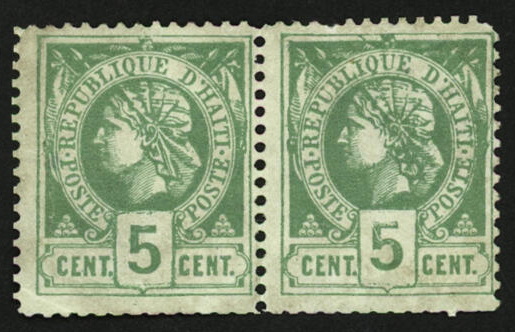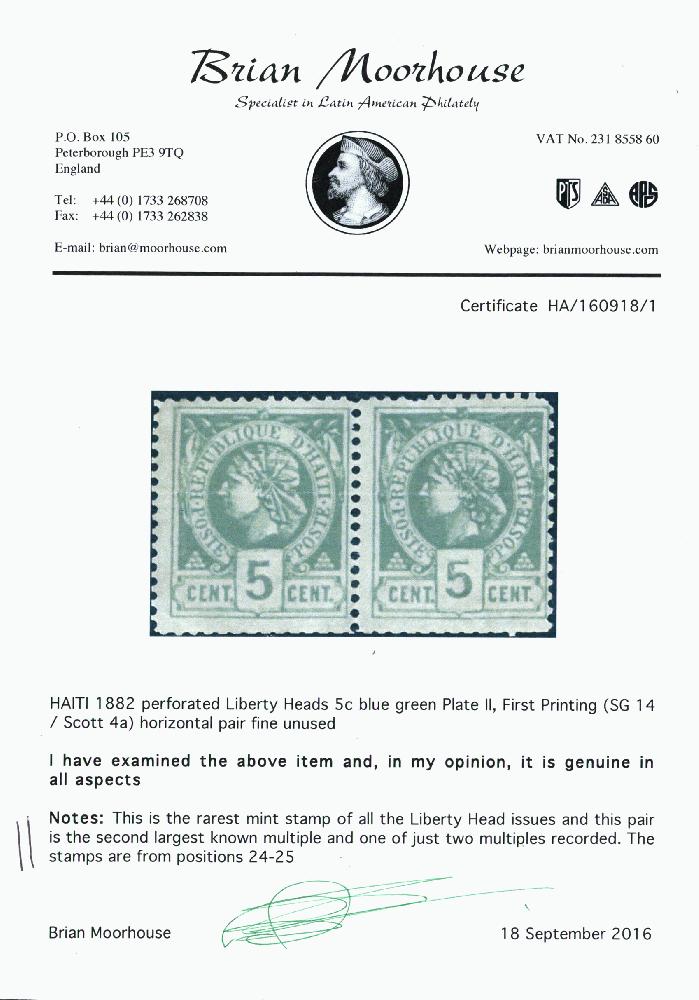 | Zusatzinformationen und Suchstichworte: | Lugdunum 129. Auktion 16. September 2024 Los 1577 Haiti HAITI: Entwurf 2c und gezähnt liberty Köpfe 5c blaugrün Platte II Erstauflage (SG 14/SCOTT 4a) waagrechtes Paar fein ungebraucht. B. MOORHOUSE Attest (die seltenste ungebrauchte Marke aller Freiheitskopf und dieses Paar ist die zweitgrößte Einheit). Pracht Zuschlag 126,00 EUR |