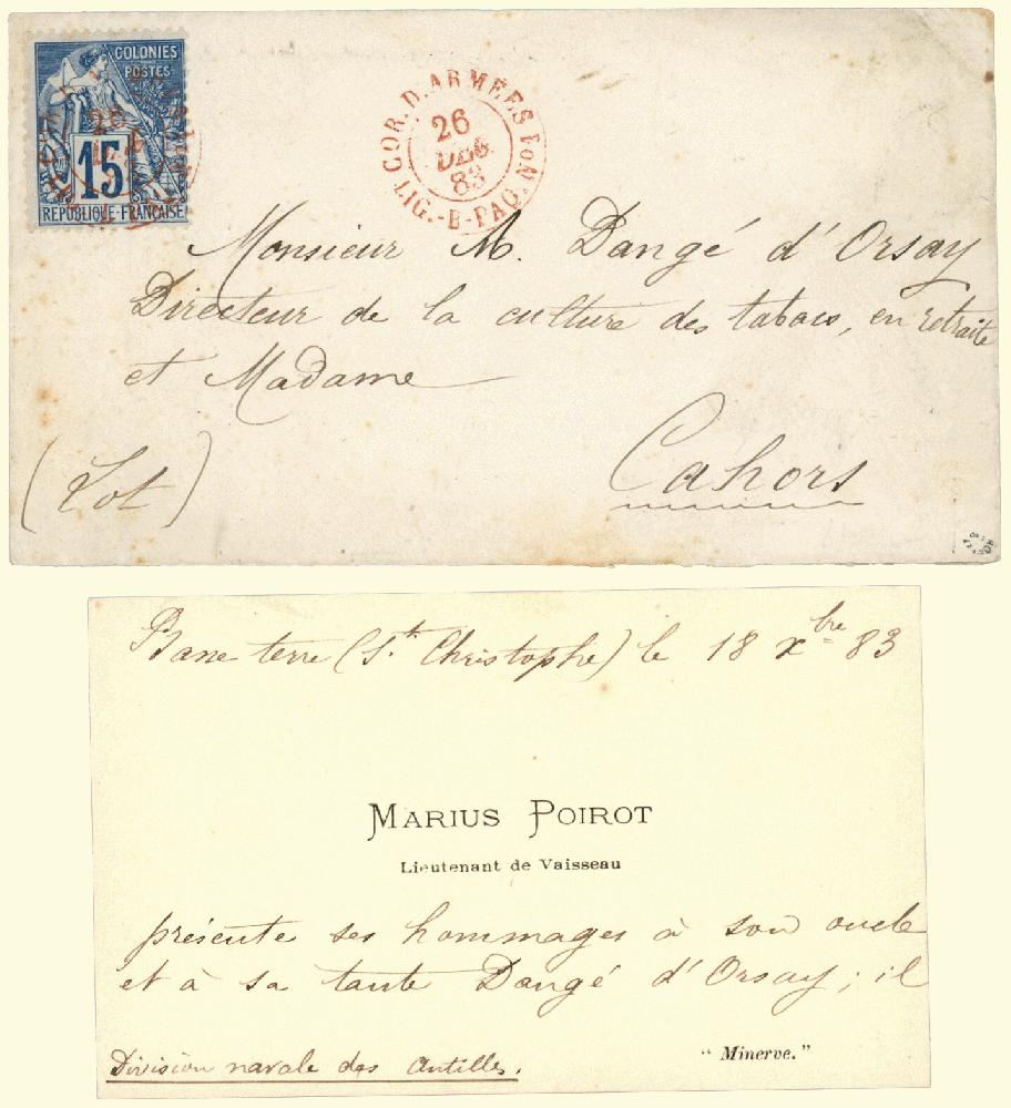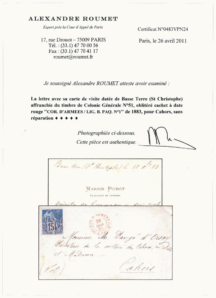 | Zusatzinformationen und Suchstichworte: | Lugdunum 129. Auktion 16. September 2024 Los 750 Guadeloupe GUADELOUPE : 1883 CG 15c obl. CORR. D' ARMEES LIG. B PAQ. N°1 en Rouge (rare) sur enveloppe avec carte de visite datée "BASSE-TERRE (ST CHRISTOPHE). Zuschlag 150,00 EUR |