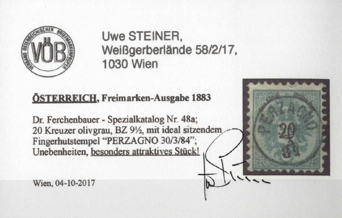 | Zusatzinformationen und Suchstichworte: | Viennafil 87. Auktion - online Live 23. April 2024 Los 17582 Österreich Abstempelungen Dalmatien "PERZAGNO 30.3.84", Fingerhutstempel auf 20 Kr. olivgrau, gezähnt Bz.9 1/2, Attest Steiner "besonders attraktives Stück" Ausruf 40,00 EUR |