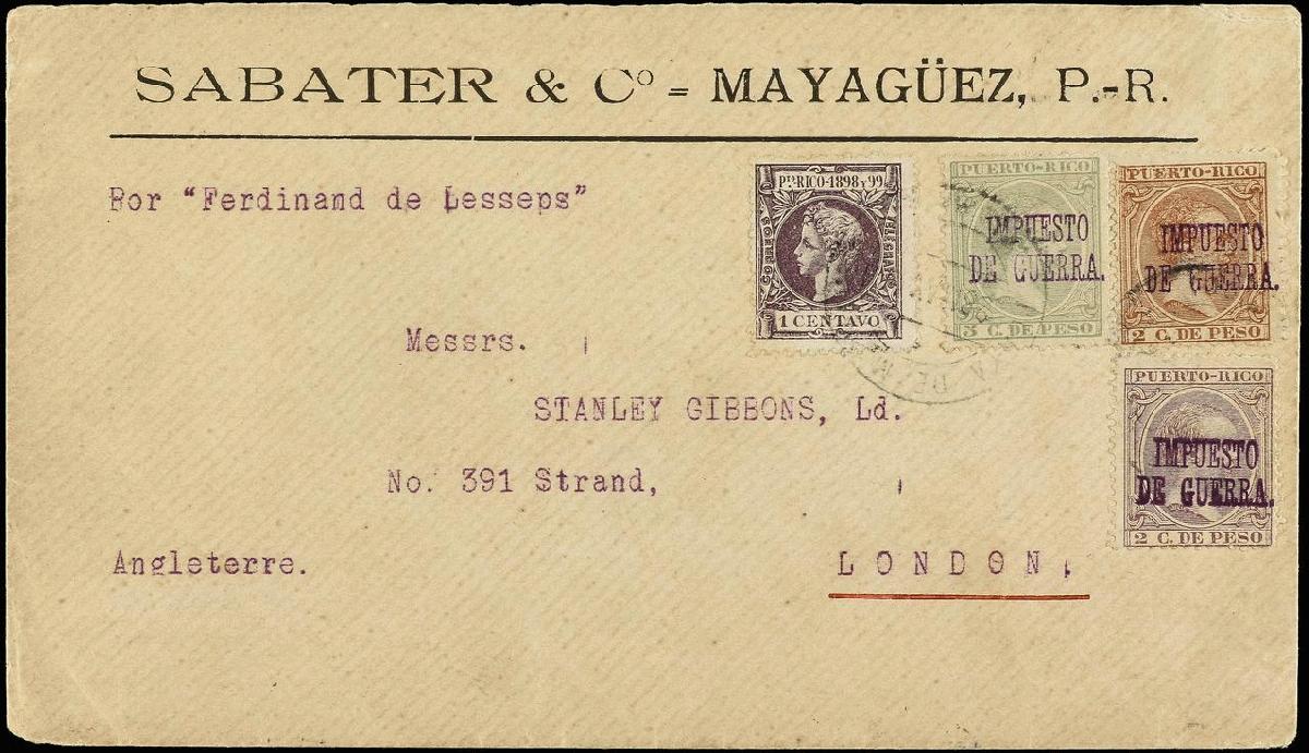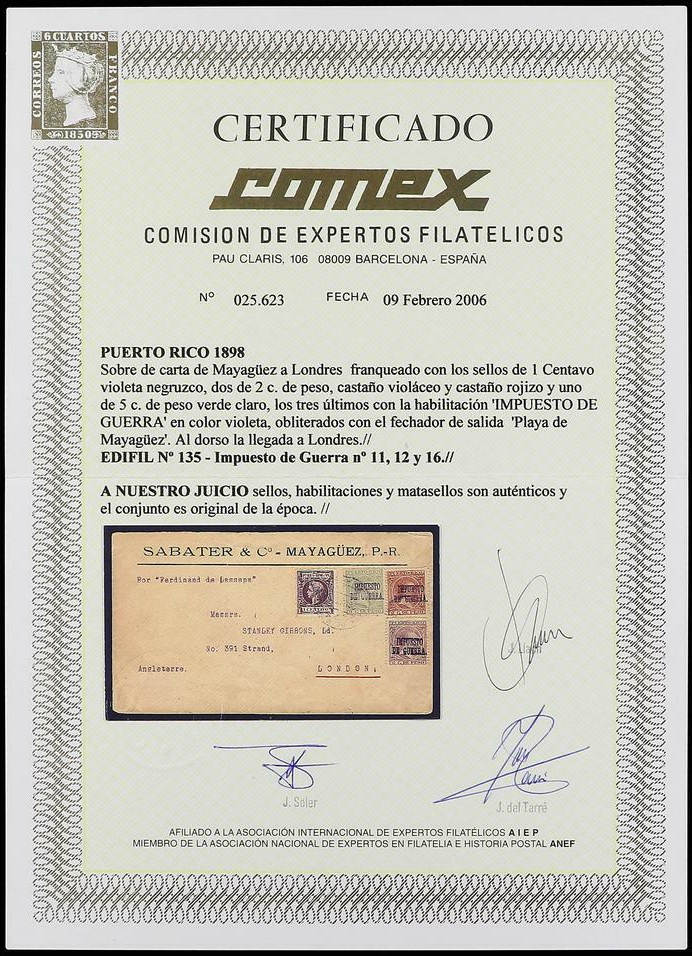 | Zusatzinformationen und Suchstichworte: | Soler y Llach - 811. Auktion - Spanien, ehemalige Kolonien & Ausland 23. - 24. Oktober 2024 Los 1380 Puerto Rico PUERTO RICO. 1898. MAYAGUEZ a LONDRES. 1 ctvo. violeta y sellos de 2 ctvos. castaño amarillo, 2 ctvos. violeta y 5 ctvos. verde habilitados IMPUESTO DE GUERRA. Rara combinación de franqueo usando sellos de Imp. de Guerra para el correo manual Ausruf 200,00 EUR |